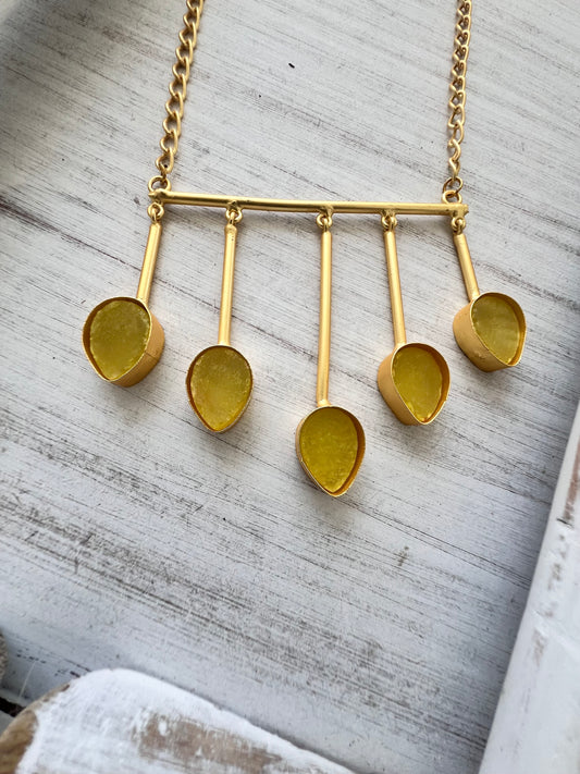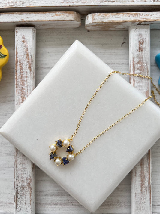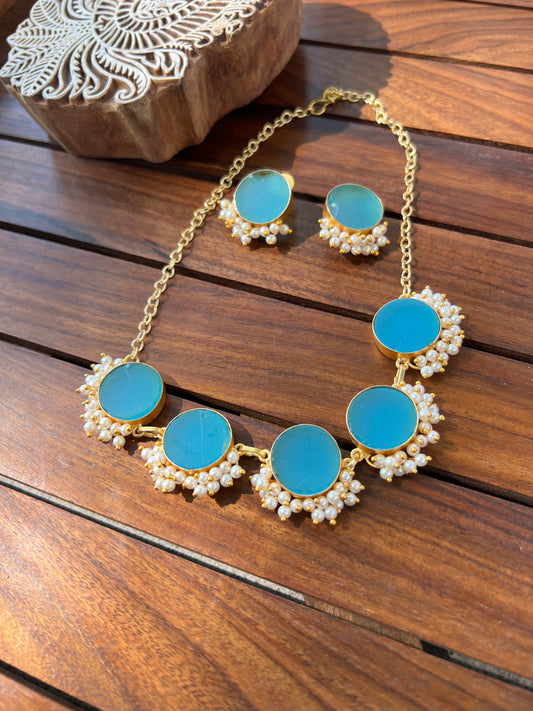 Gold Plated Raw Stone Moon and Pearls Necklace with Earring